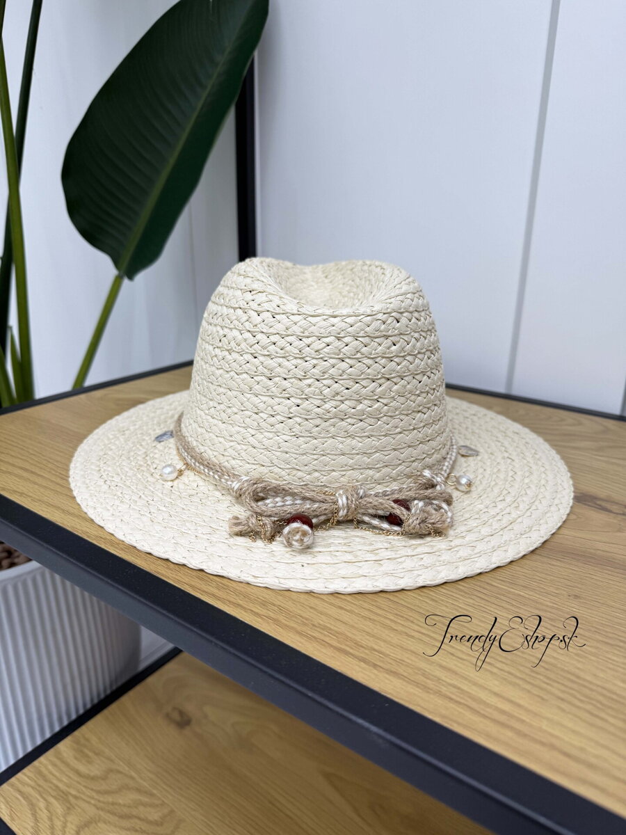 Štýlový klobúk ozdobený rietiazkou, šnúrkou a rôznymi príveskami.