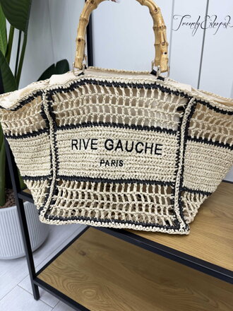 Slamená plážová taška s dvomi drevennými úchytkami, ozdobená čiernym nápisom "RIVE GAUCHE paris". Uzatváranie na zips. Dostatočne priestranná.