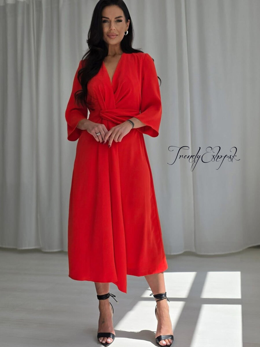 Elegantné midi šaty s prekladaným véčkovým výstrihom, 3/4 rukávmi a gumičkou v páse na zadnom dieli, ozdobené látkovým pásom na prednom dieli. (?)