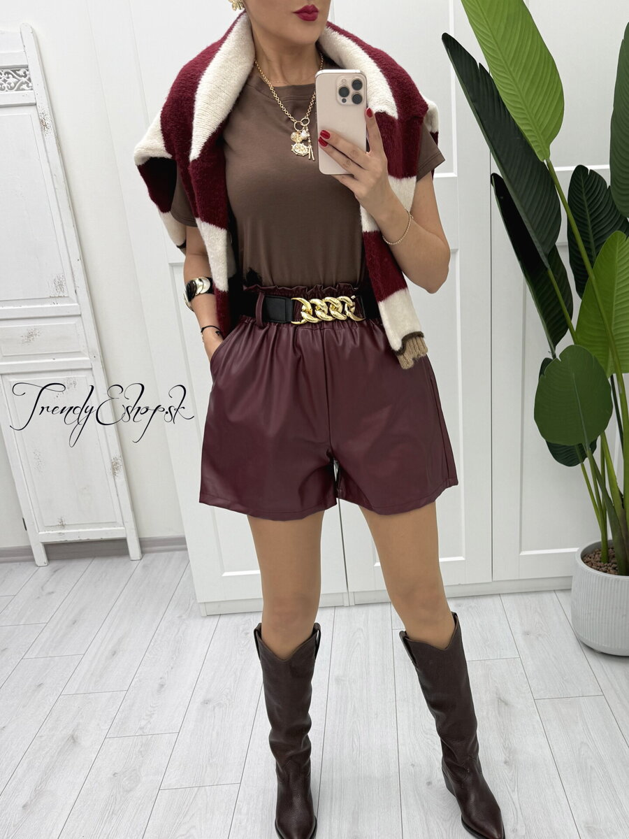 Koženkové kraťasy s riaseným gumičkovým pásom a bočnými vreckami, doplnené gumičkovým opaskom kombinovaný s reťazou. Mierne áčkový strih. (84)