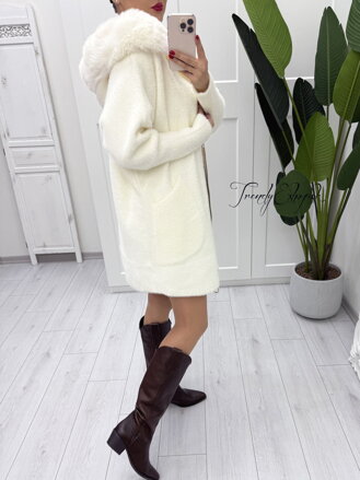 Príjemný kabát s kapucňou a kožušinou Alpaka - smotanová B1986