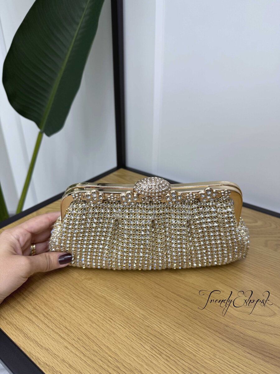 Nádherná večerná kabelka vrecovitého tvaru, zdobená štrasovými kamienkami a krátkym zlatým putkom. Súčasťou je aj dlhé, retiazkové ramienko, ktoré je možné odopnúť.