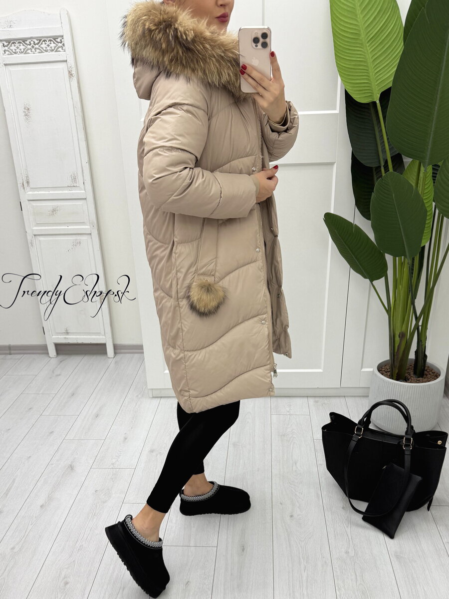 Nádherná prešívaná bunda s kapucňou, ozdobená dvoma šikmými vreckami s kožušinovým brmbolcom a s pravou kožušinkou na kapucni, ktorú je možné odopnúť. Zapínanie na zips a cvoky. Kožušina na kapucni sa môže jemne líšiť, nakoľko je každý kus originál. Užší strih. (14)