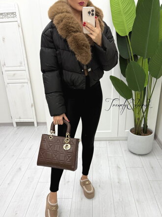Krátka "PUF" bunda s prešívaním, jemne padnutými plecami a dlhými rukávmi, ozdobená prednými vreckami a nádhernou hnedou kožušinou, ktorú je možné odopnúť. Zapínanie na dva cvoky. Spodný lem je ukončený gumičkovým patentom. (88)