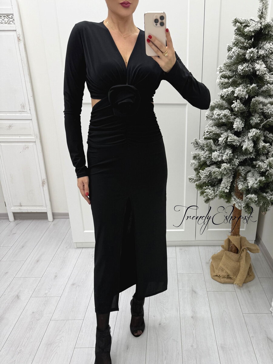 Riasené šaty obtiahnutého strihu, s hlbokým véčkovým výstrihom a dlhými rukávmi, ozdobené 3D ružou a vykrojením na bokoch a zadnom dieli. Šaty sú doplnené predným rozparkom. (14)