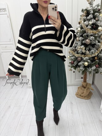 Moderný dámsky sveter s nadčasovým pruhovaným vzorom a praktickým zipsom pri krku, ktorý umožňuje variabilné nosenie – zapnutý pre elegantnejší vzhľad alebo rozopnutý pre ležérny štýl. Voľnejší strih a predĺžené rukávy dodávajú svetru trendy vzhľad a maximálne pohodlie.