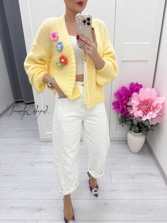 Hravý a originálny kardigán v jemnom žltom odtieni, ozdobený farebnými kvetinovými aplikáciami, ktoré mu dodávajú veselý a ženský charakter ❤️ Výrazný kúsok, ktorý rozžiari každý outfit a pritiahne pozornosť na prvý pohľad. Kardigán je vyrobený z mäkkého úpletu, ktorý je príjemný na nosenie a ideálny na prechodné obdobie. Voľnejší strih zabezpečuje pohodlie a ležérny, trendy vzhľad.