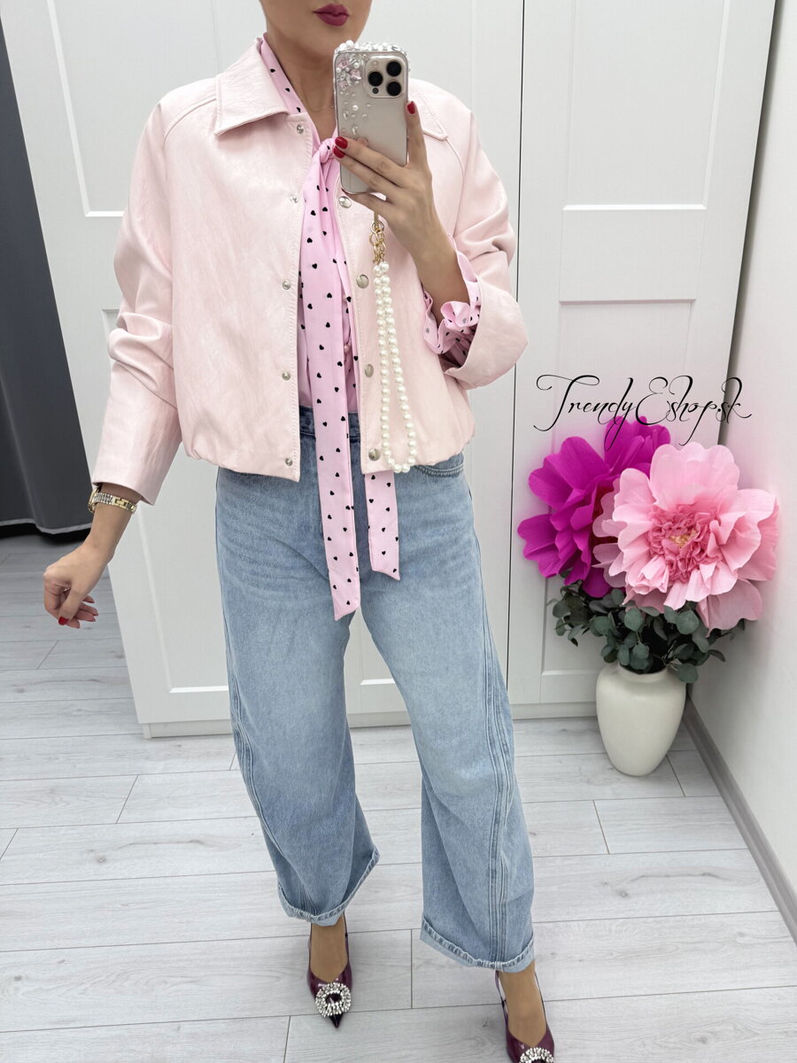 Štýlová krátka bunda v jemnom svetlo-ružovom odtieni je ideálnym prechodným kúskom, ktorý krásne doplní jarné aj jesenné outfity. Má moderný, mierne boxy strih, klasický golier a zapínanie na cvoky, vďaka čomu pôsobí elegantne, no zároveň uvoľnene.