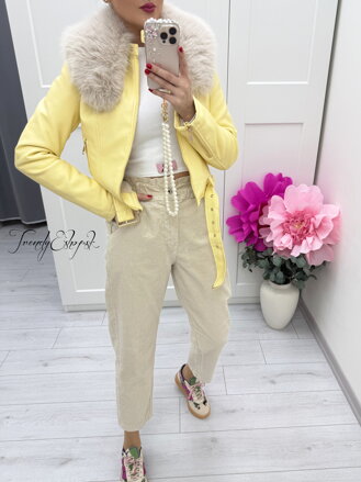 Dámska žltá bunda, jarná dámska bunda, prechodná bunda s kožušinou, dámska bunda s opaskom, štýlová jarná bunda pre ženy ❤️ (8)