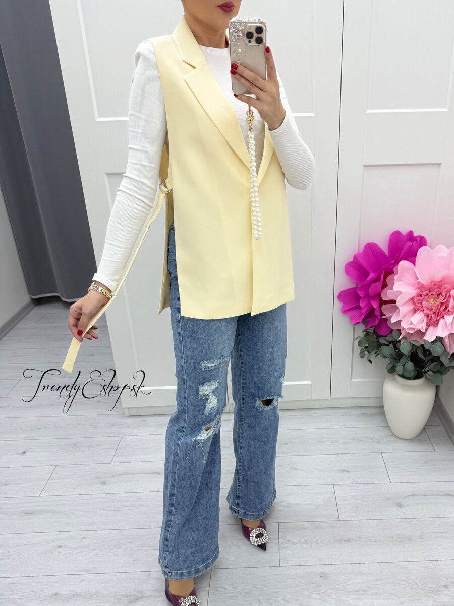 Štýlová a elegantná dámska vesta v jemnom maslovo-žltom odtieni, ktorá krásne rozžiari každý outfit ❤️ Nadčasový kúsok ideálny na jar, leto aj prechodné obdobie, vhodný na vrstvenie aj samostatné nosenie.