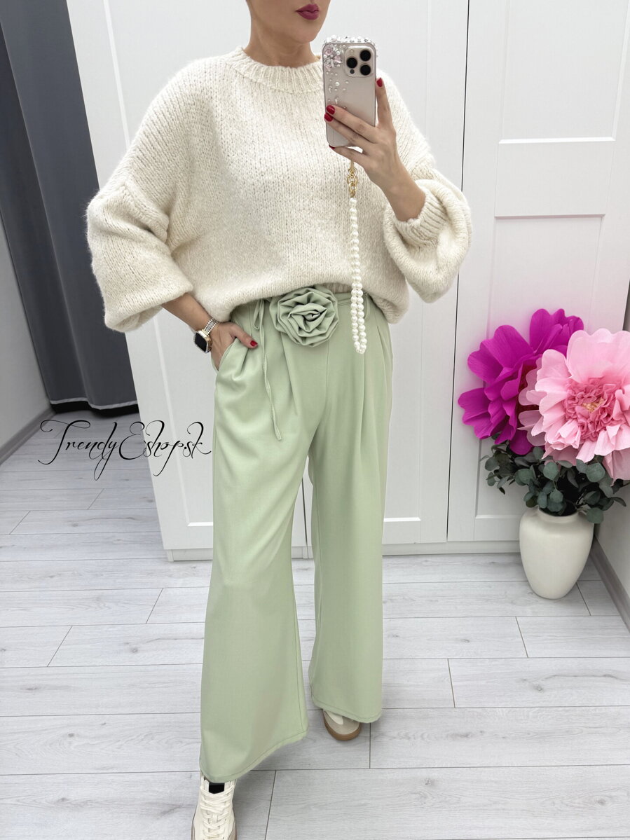 Dámske široké nohavice, svetlozelené nohavice, nohavice s vysokým pásom, nohavice s látkovým kvetom, elegantné dámske nohavice ❤️ (11)
