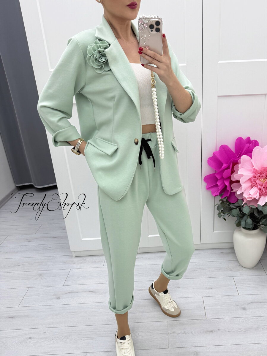 Patelovo-zelený nohavicový komplet so sakom a 3D ružou C138