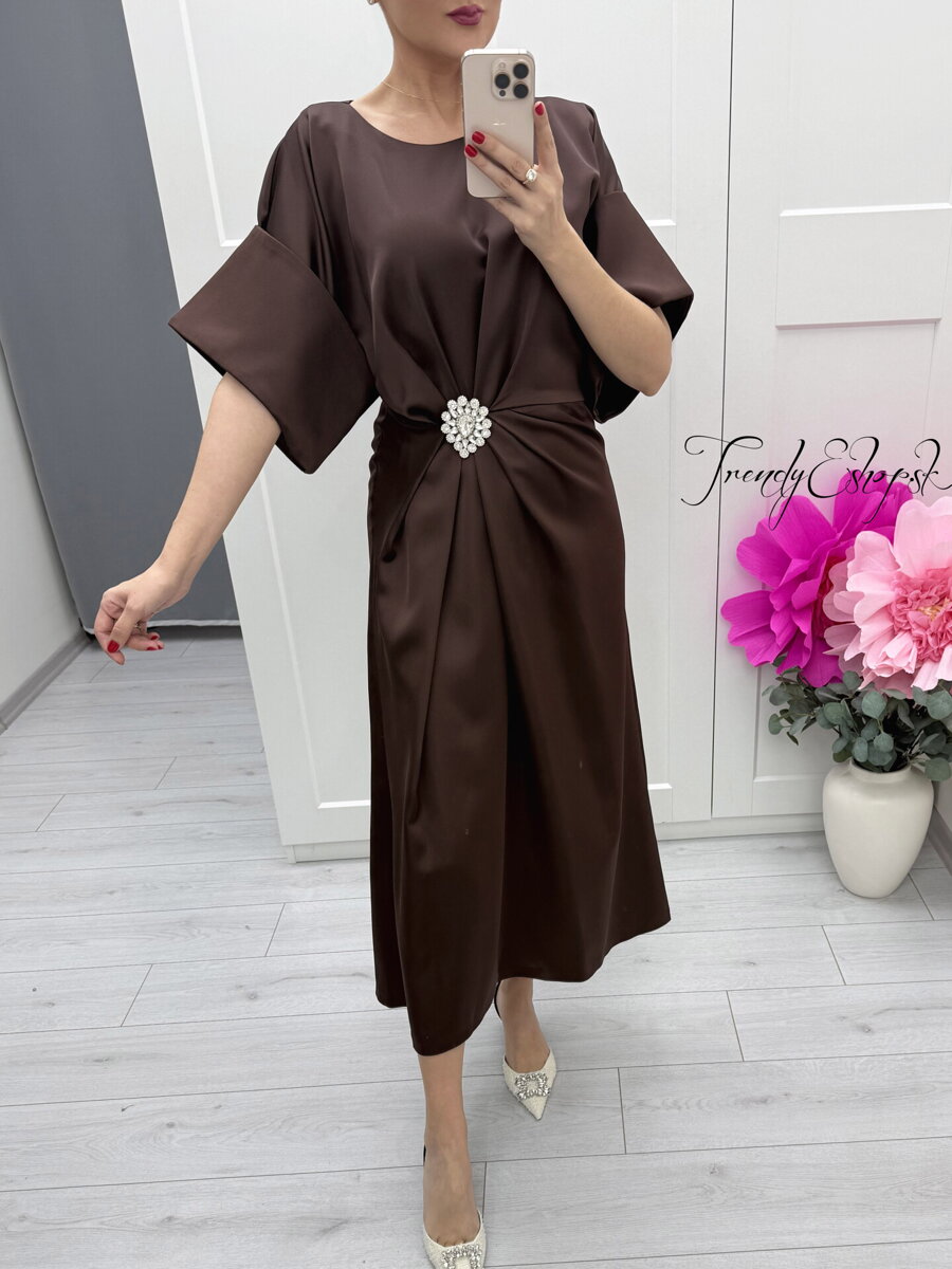 Elegantné saténové šaty, spoločenské midi šaty, šaty s brošňou, hnedé elegantné šaty, dámske šaty na svadbu, šaty so zadným zipsom, luxusné šaty na oslavu ❤️ (14)