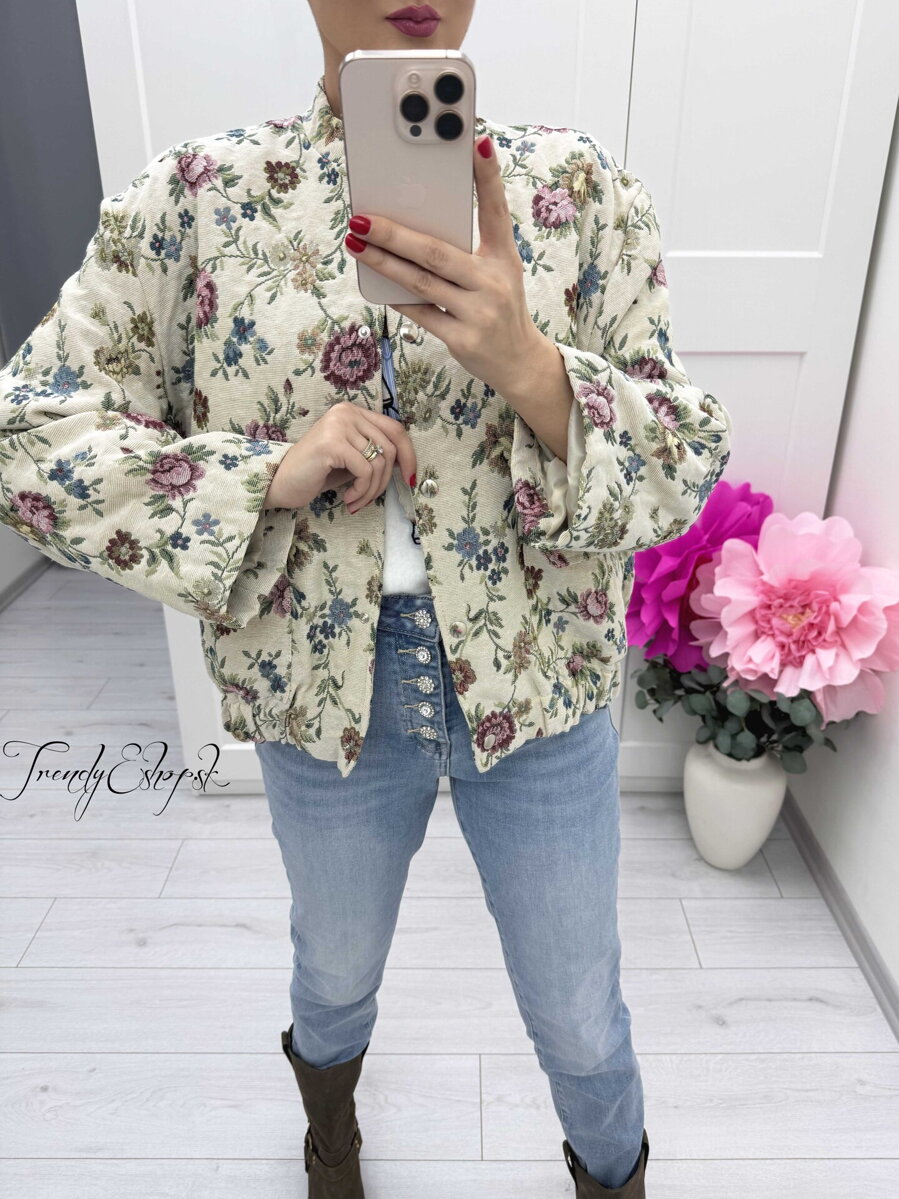Štýlová a originálna bunda s romantickým kvetinovým vzorom, ktorá okamžite oživí každý outfit ❤️ Jemný podklad v kombinácii s výraznejšími kvetmi pôsobí elegantne a zároveň sviežo.