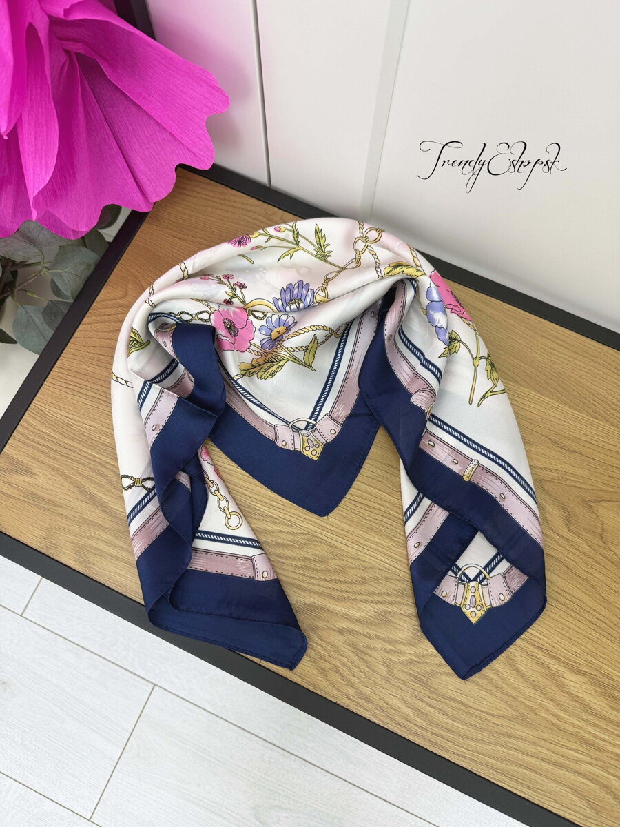 Hodvábna kvetinová šatka, ktorá ozdobí každý outfit. Možné nosiť na viacero spôsobov, na hlave, krku, kabelke a rifliach.