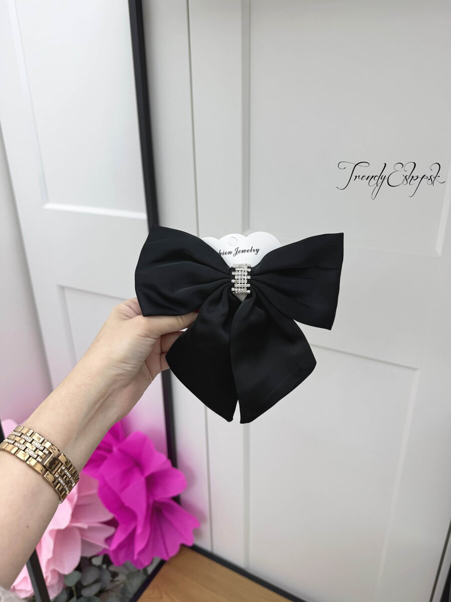 Saténová spona do vlasov v tvare mašle, ozdobená štrasovými kamienkami.