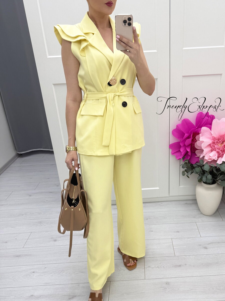 Komplet pozostáva z elegantnej vesty bez rukávov s výraznými volánovými detailmi na ramenách a pohodlných nohavíc. Vesta sa zapína na gombíky a v páse sa viaže opaskom, vďaka čomu krásne zvýrazní postavu.