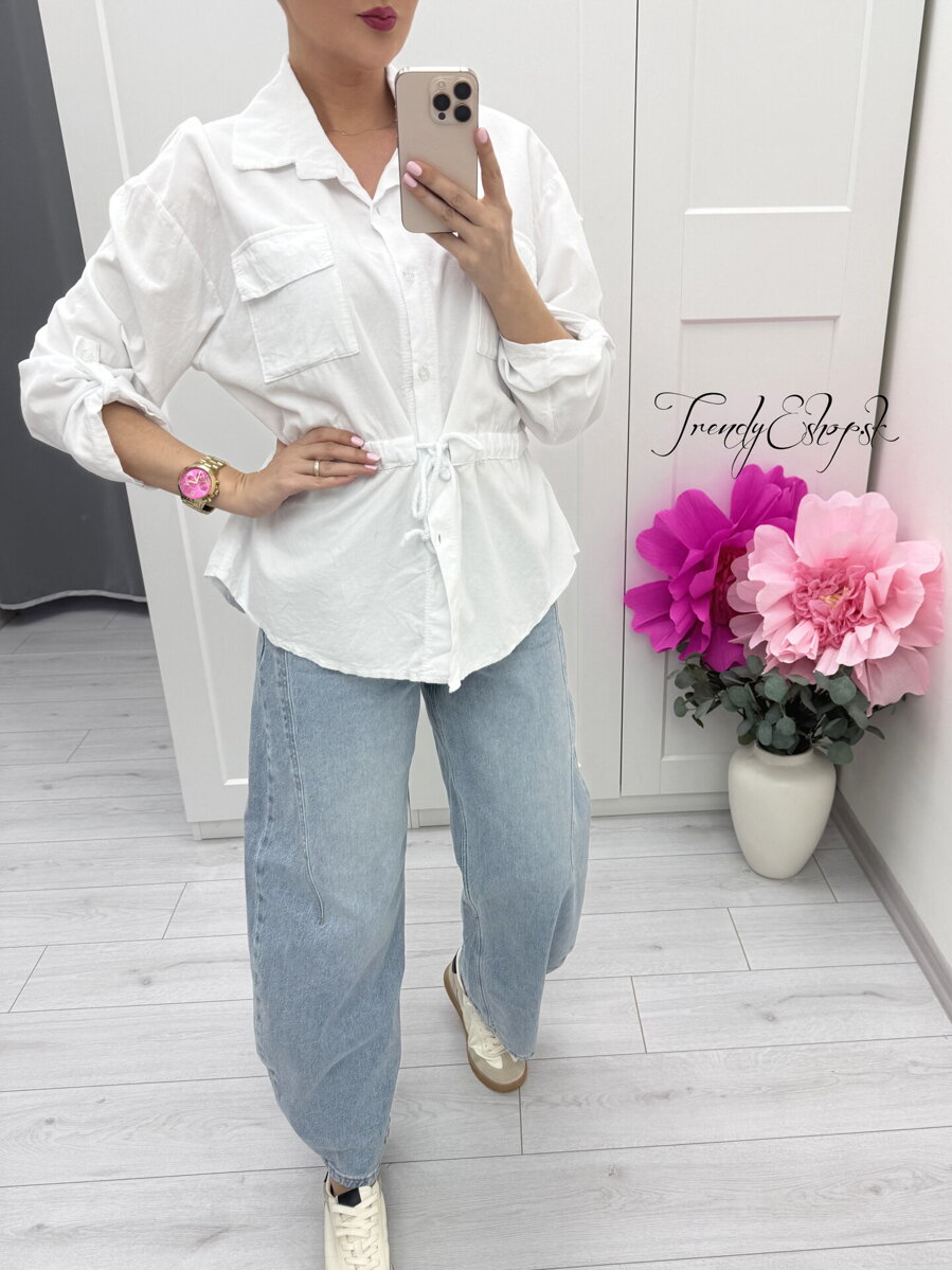 Košeľa má klasický golier, zapínanie na gombíky a praktické predné vrecká, ktoré dodávajú moderný, mierne utilitárny vzhľad. V páse sa nachádza šnúrka na stiahnutie, vďaka ktorej si ju prispôsobíš podľa postavy a vytvoríš peknú ženskú líniu.
